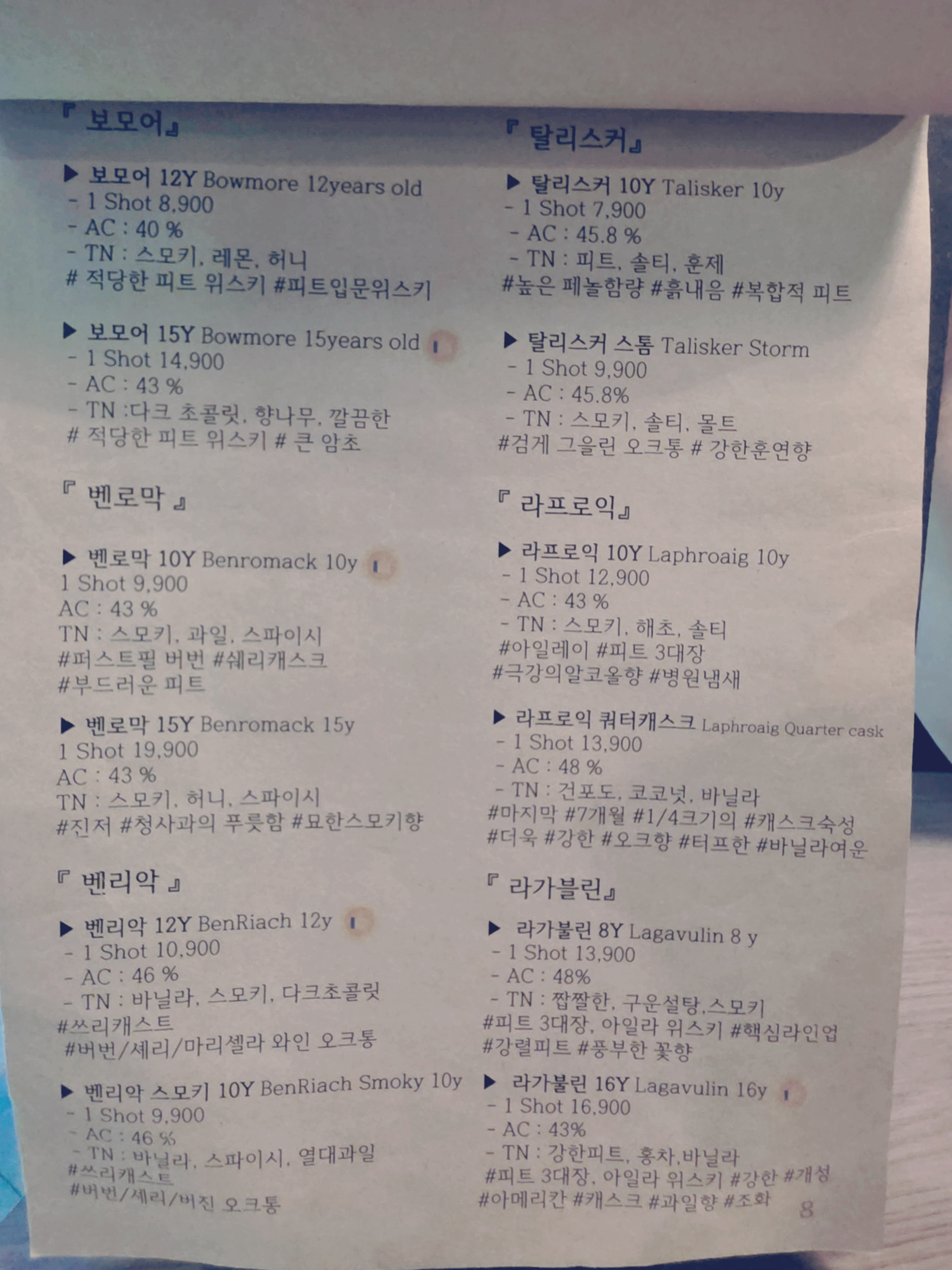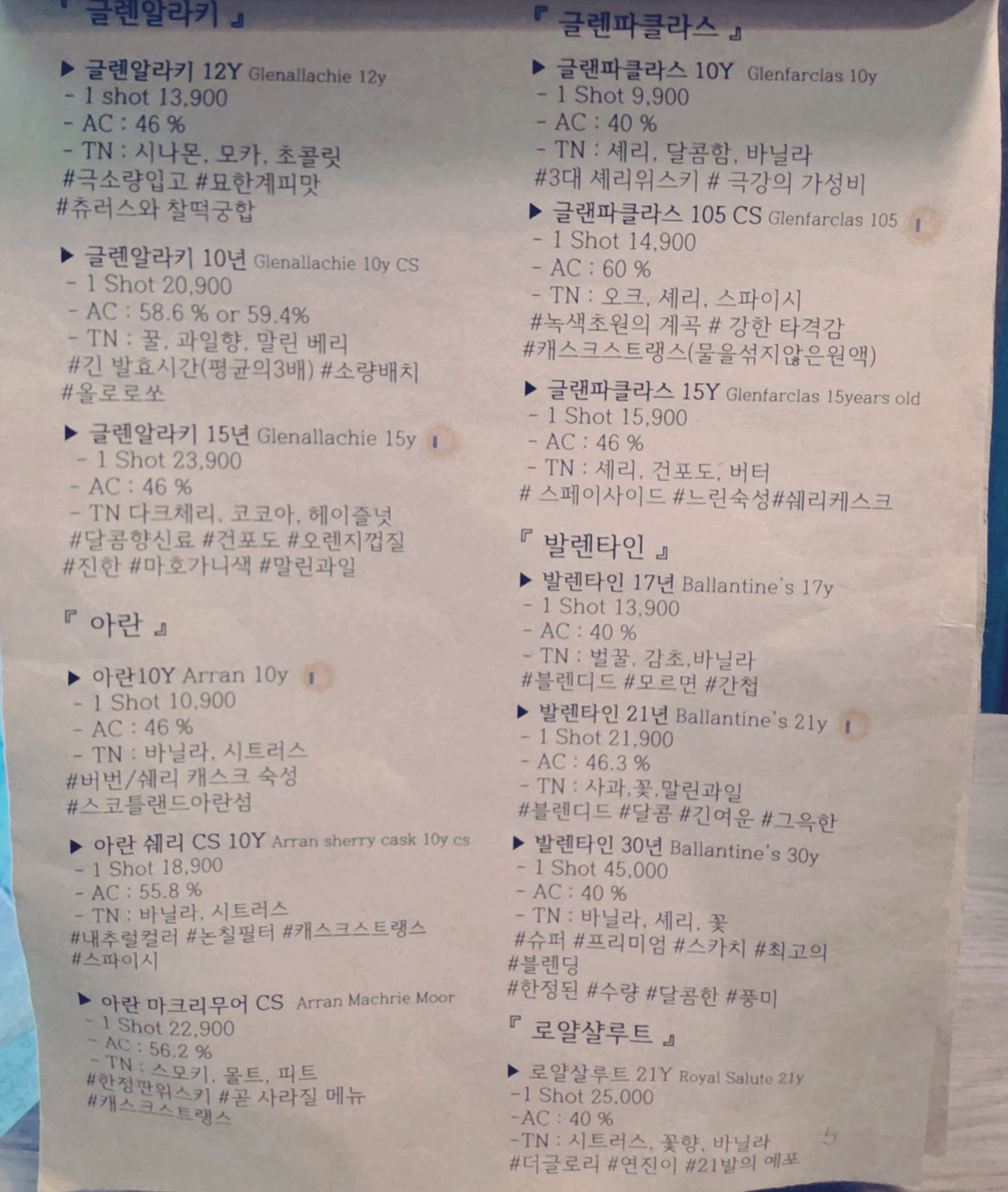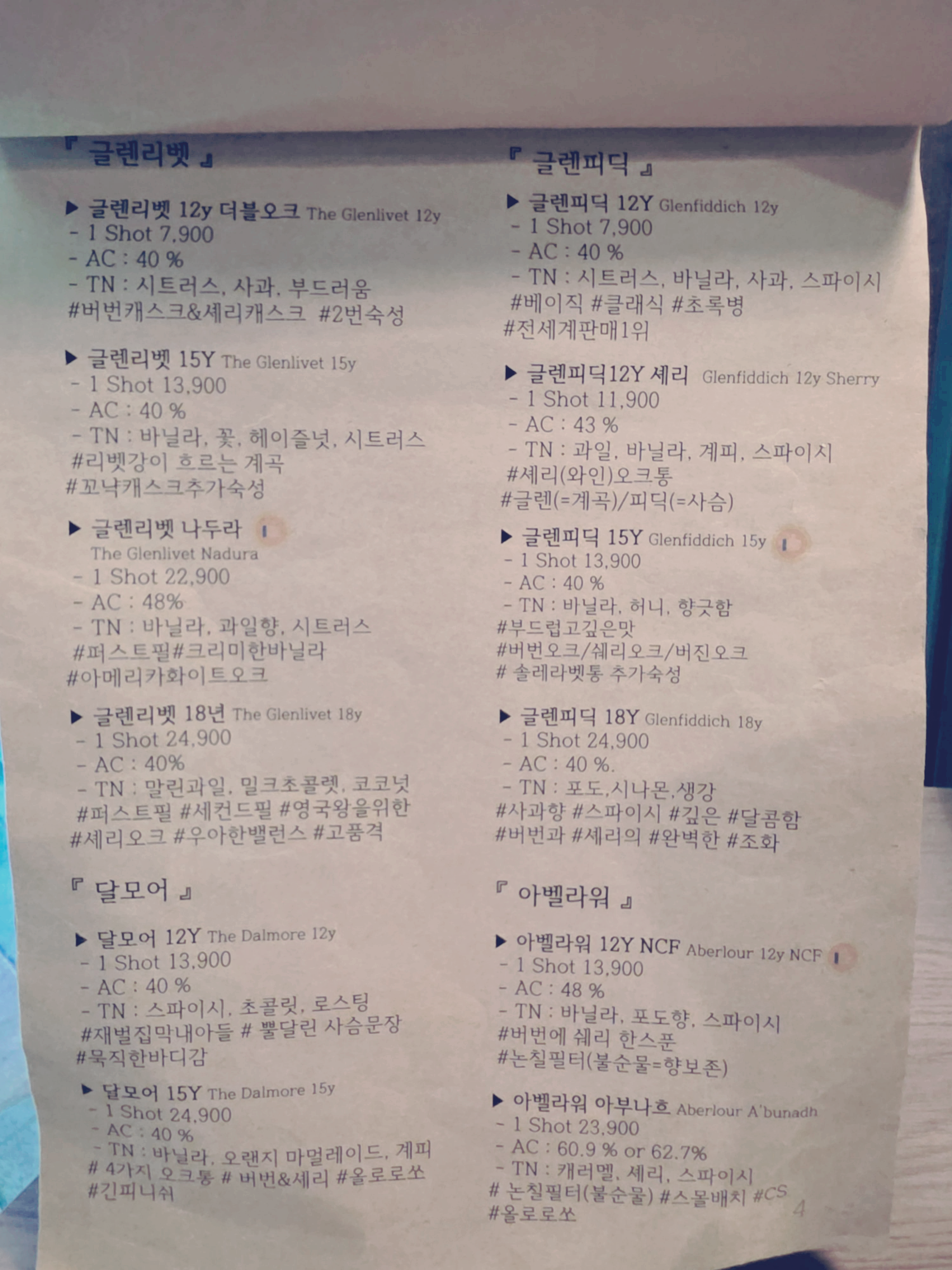메뉴판을 보면 위스키 종류가 진짜 다양해.